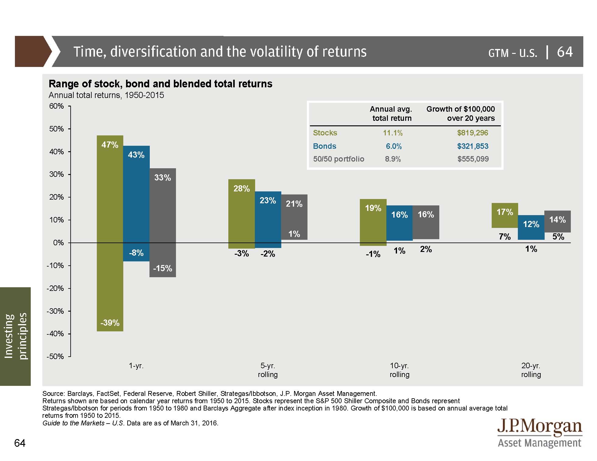 The way I have overcome this 10% annual return anchor and improved my perspective for long-term investing comes from the following chart from JPMorgan Asset Management: “Time, diversification and the volatility of returns”. This chart shows the range of returns for different investment periods back to 1950 for stocks and bonds. While the annual average return for stocks during this period was 11.1%, you can see that even over 20-year periods the annual return for stocks can range from 7% to 17%. This is a huge difference when compounded over 20 years (almost six times more total growth for the higher return).