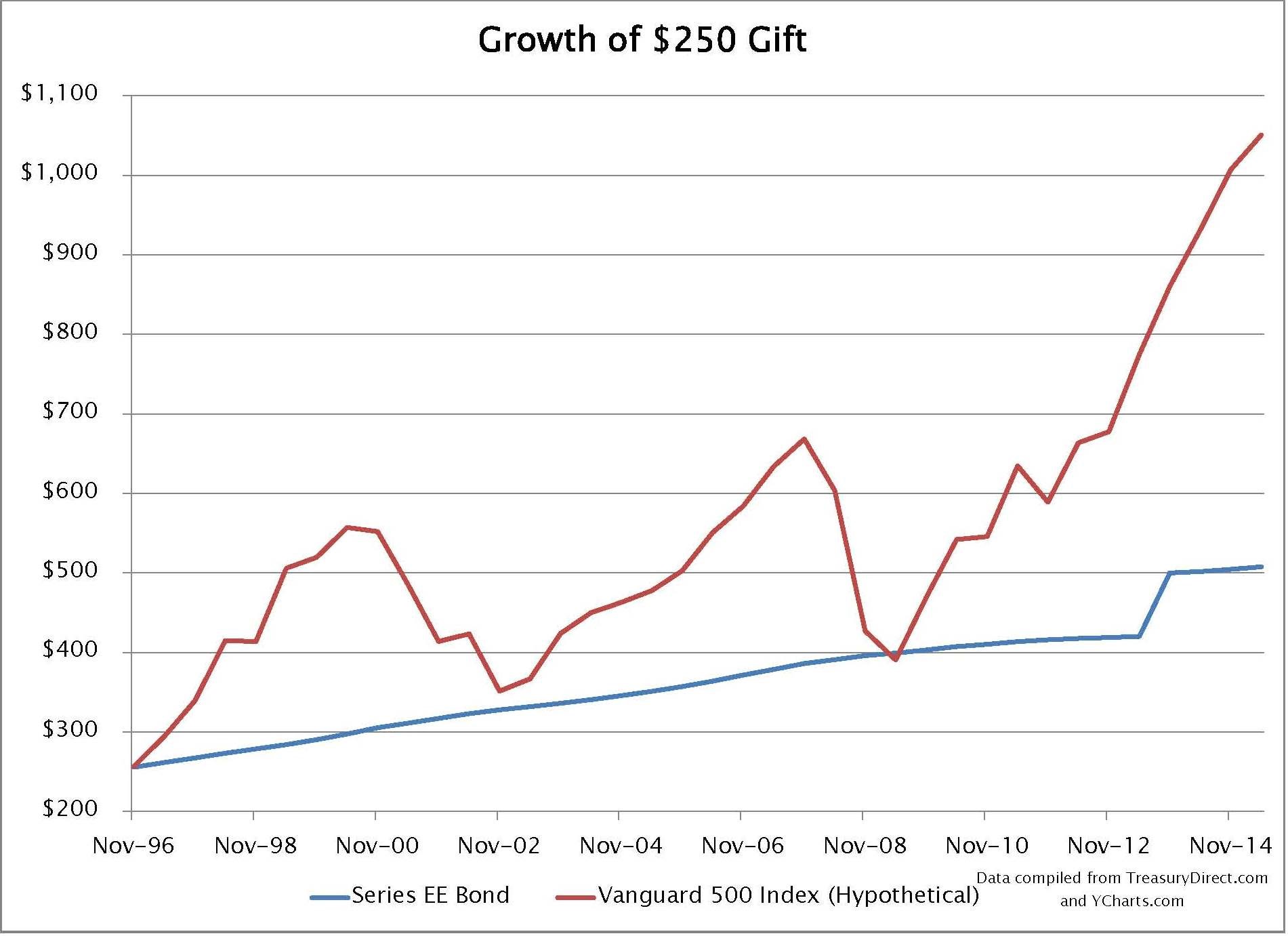 While this return is not great, it was a gift. Who can complain about that? Also, the savings bond she purchased in 1996 beat inflation by about 1.5%. Had I received $250 in 1996, it probably would have been spent on cheap beer and pizza. In my mind, the savings bond was a great gift and decent investment.