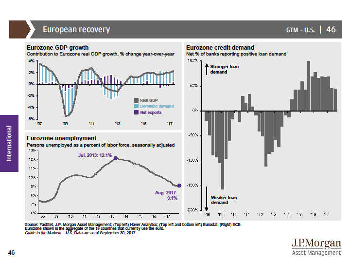 As Europe’s economic powerhouse, and a key driver behind the strong Euro, Germany’s election jolted the markets, leading to a weakening Euro and corresponding strengthening dollar. While many international markets mutual funds and ETFs are denominated in Euros and likely were hurt by that weakness, ultimately many European companies should benefit from the cheapening currency. Thus, the MSCI Europe stock market index actually was one of the big winners for the month, gaining around 3%. How long this trend continues is anybody’s guess, but as shown in the charts below, Europe’s demand for loans, GDP, and unemployment have all drastically improved over the last two years.